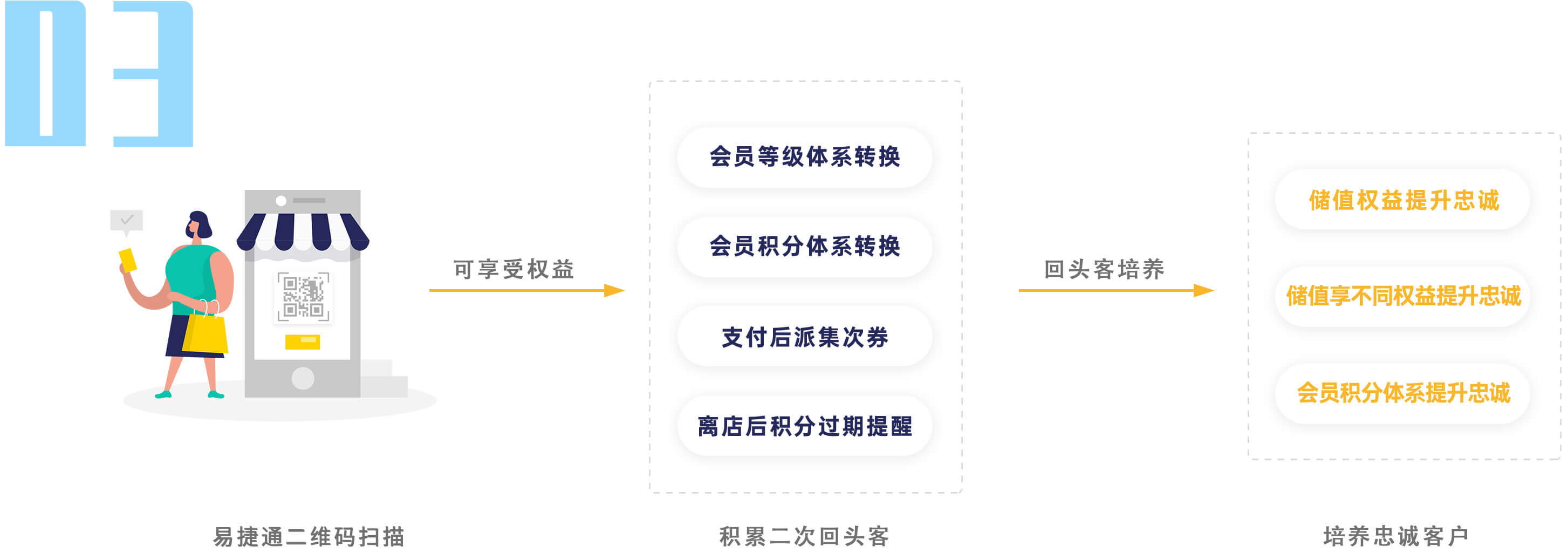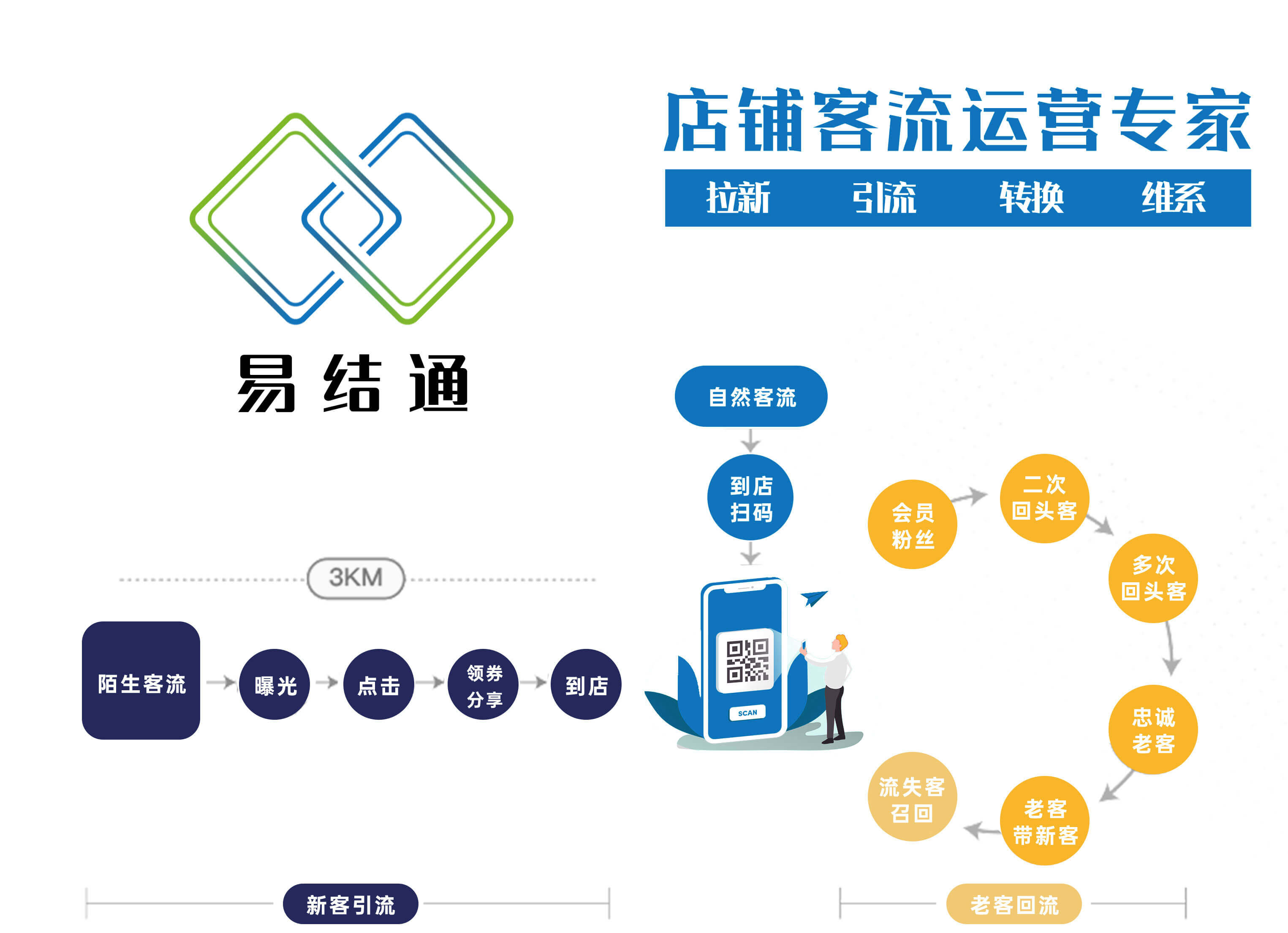 易结通基于对实体店铺商户与消费者业务交互的互联网化创造了线下流量的新空间,并通过自动化的运营实现线下流量管理,不断地帮助商户将流量转化为到店消费客流及收入