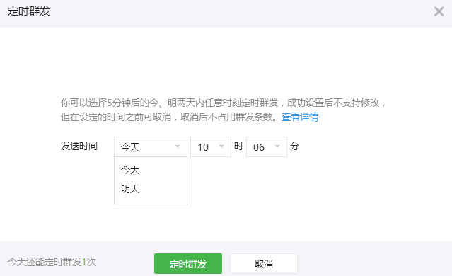 你可以定时五分钟后的今、明两天内任意时刻群发,成功设置将占用群发时刻当天的一条群发条数。定时消息不支持修改,修改素材库消息也不会改动定时消息的内容。